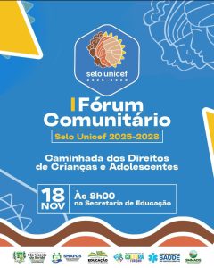 O município de São Vicente do Seridó/PB irá realizar o ‘I Fórum Comunitário Selo Unicef 2025-2028’, na terça-feira (18/11), a partir de 08h00, no auditório da Secretaria Municipal de Educação. O evento será norteado pelo tema: ‘Caminhada dos Direitos de Crianças e Adolescentes’. O objetivo principal do fórum é fomentar a participação popular na construção de um plano de ação a partir de um diagnóstico da situação da infância município.